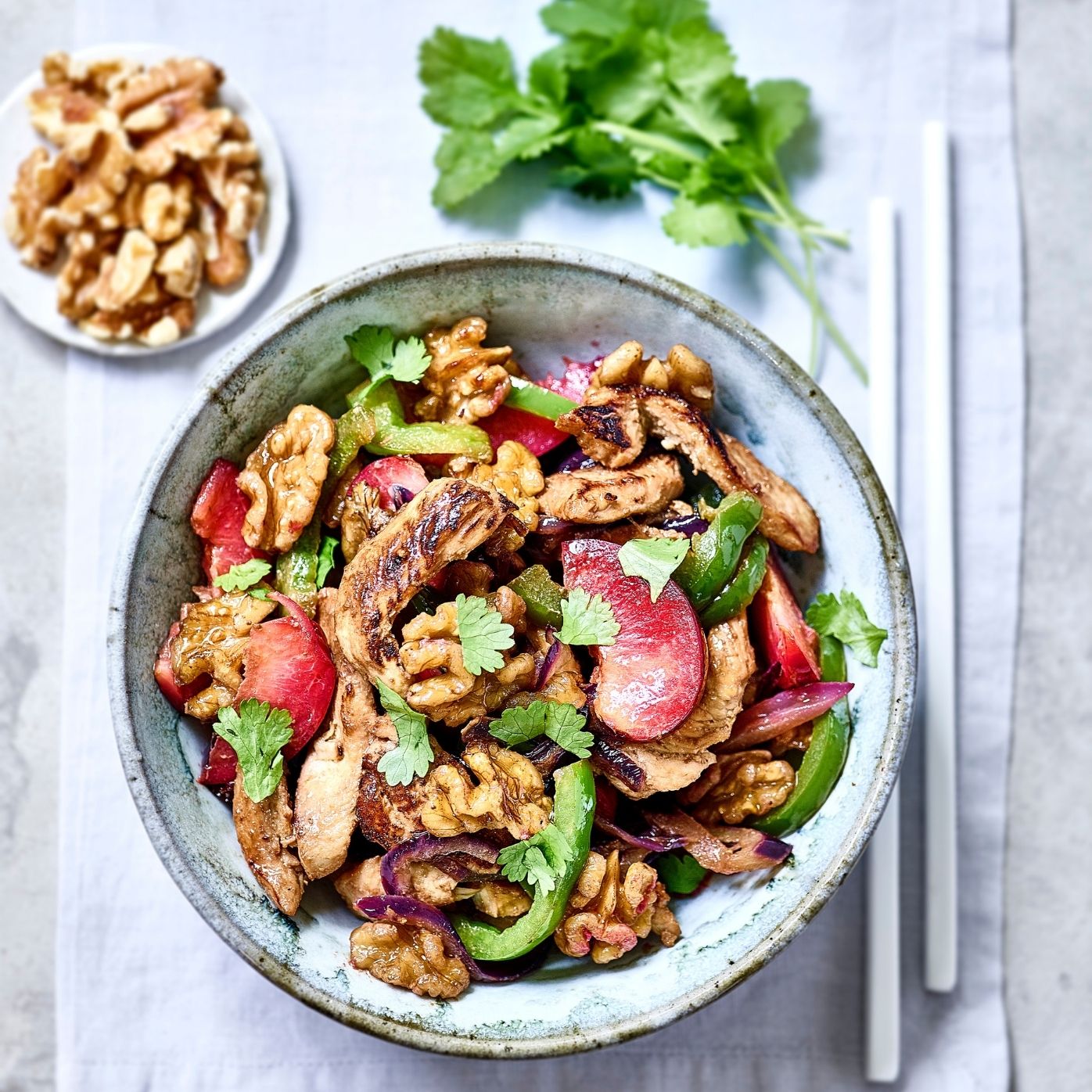 Simple and delicious, this Miso California Walnut & Chicken Stir Fry can be rustled up in just 10 minutes. Great served with rice or noodles.