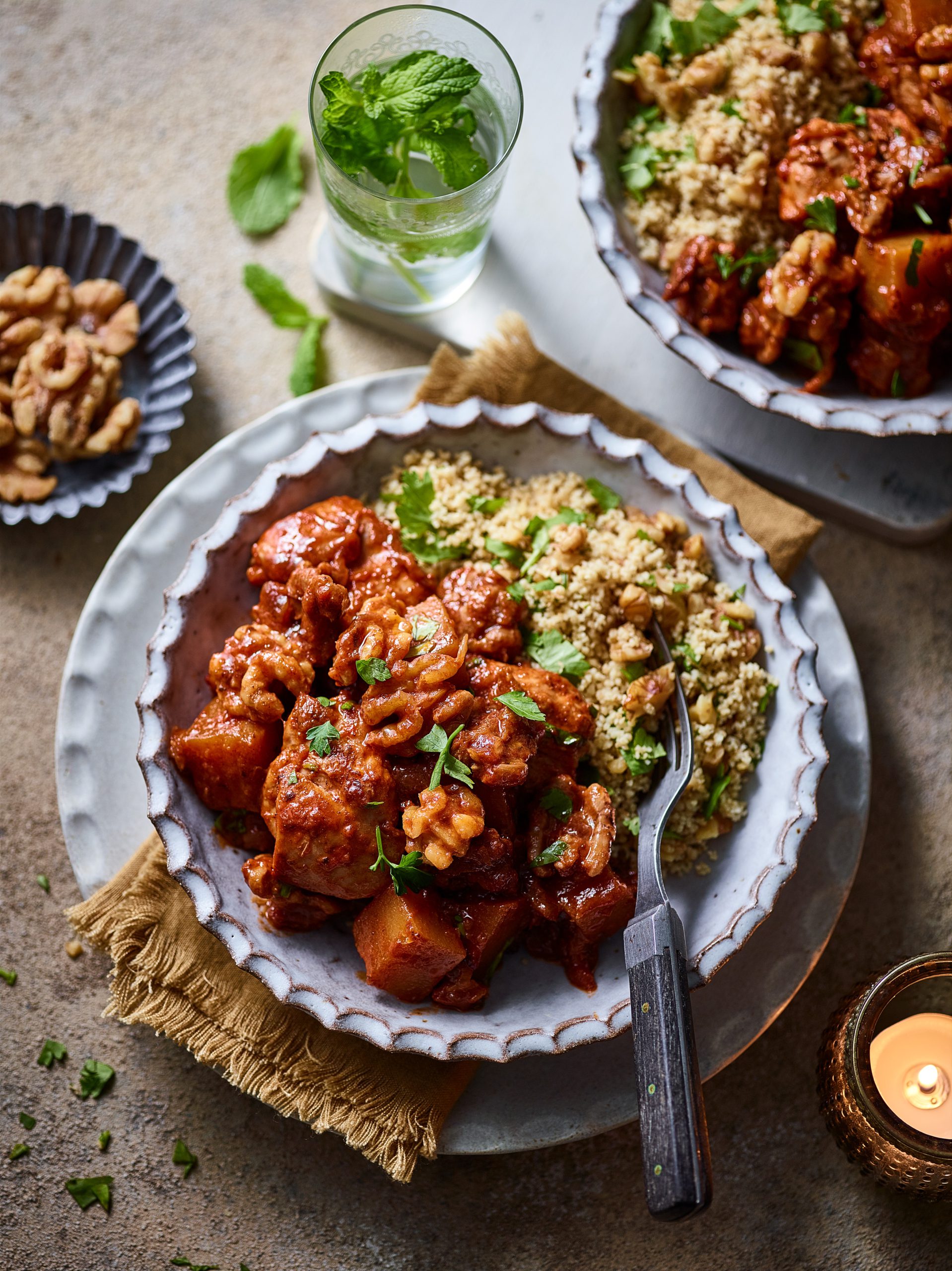 • Sprinkle the tagine with the remaining coriander and serve with the couscous.