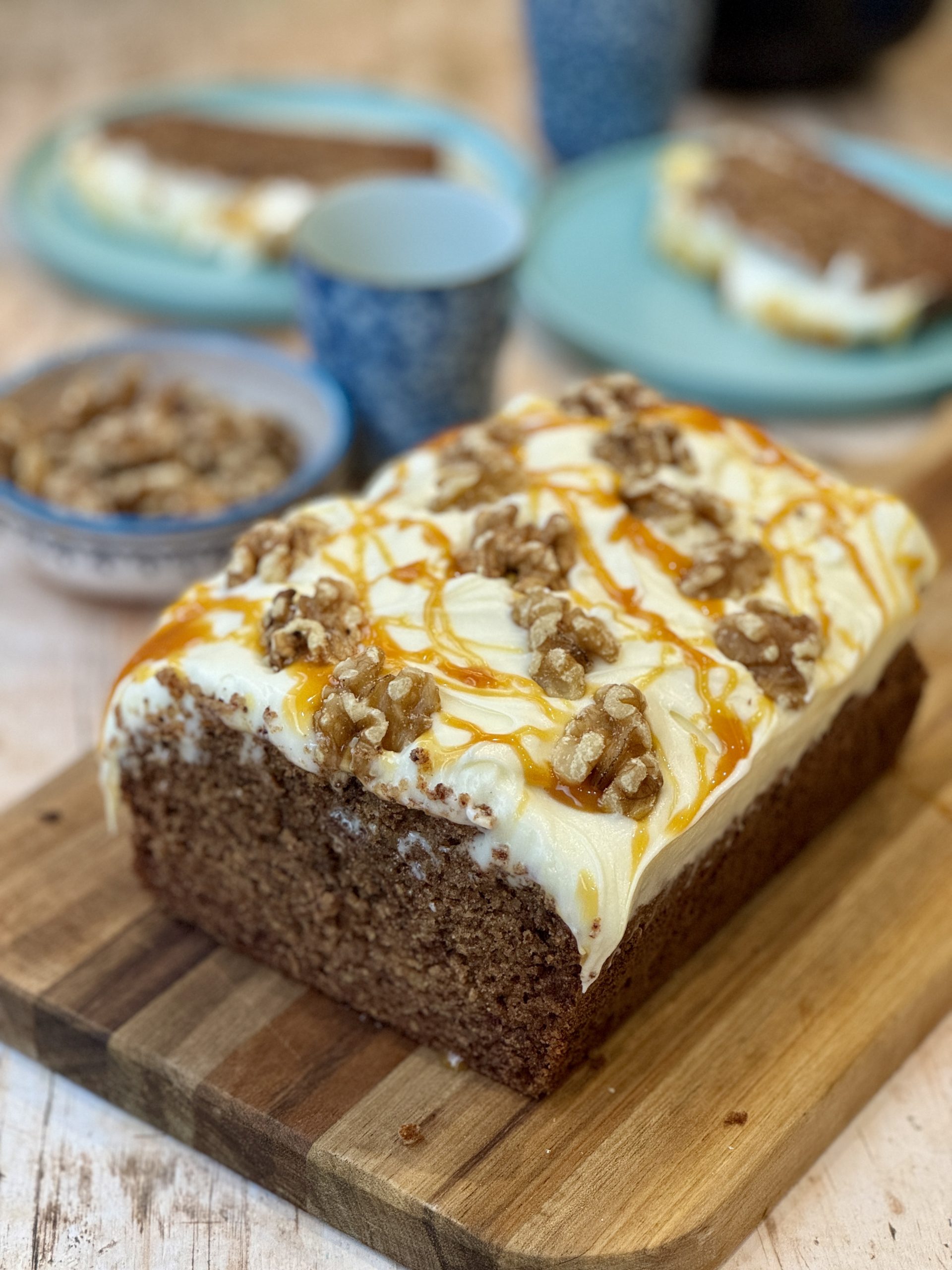 - To make the butter cream, whisk together the butter and cream cheese and then add the icing sugar, a few tablespoons at a time, until super creamy and smooth. Dollop over the cooled cake and stud with the remaining California Walnuts. Drizzle over a little salted caramel sauce and serve immediately.