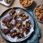 Spread with the Walnut butter and then pour over the chocolate and spread until evenly coating the rectangle. Sprinkle with the chopped Walnuts and chill until set.